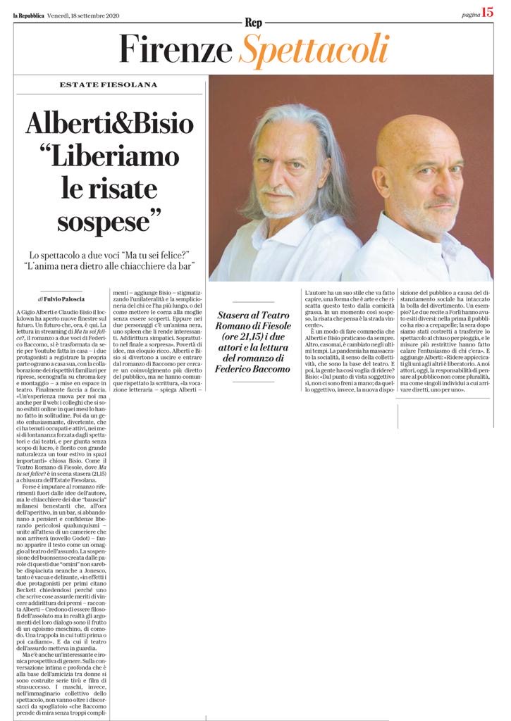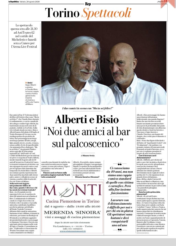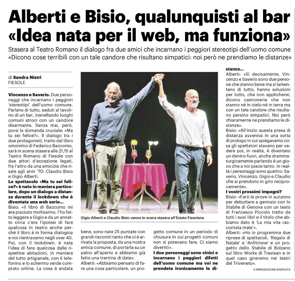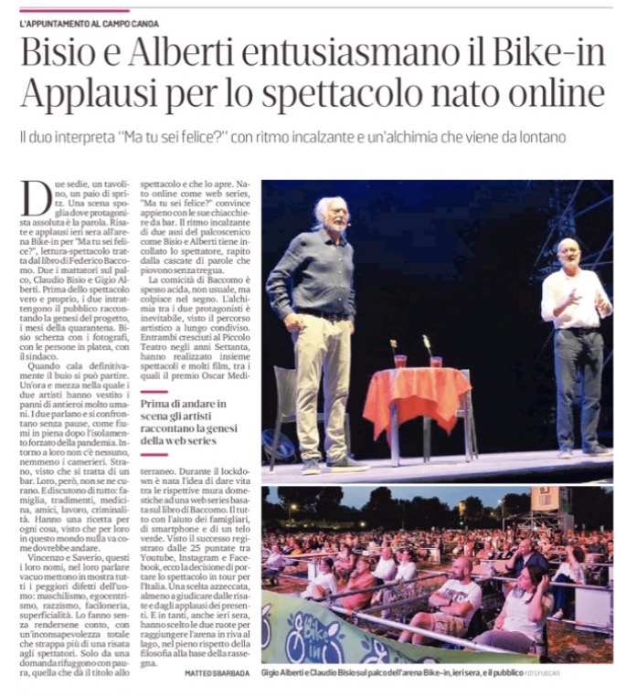 Quella stessa domanda, è passata dalle pagine del libro di Federico Baccomo (Solferino, aprile 2019) alle immagini della web series estemporanea, realizzata da Claudio Bisio e Gigio Alberti durante il lockdown (YouTube/ClaudioBisio, aprile 2020), quando hanno deciso di vestire i panni di Vincenzo e Saverio e mettere in scena “a distanza” le loro chiacchiere da bar.