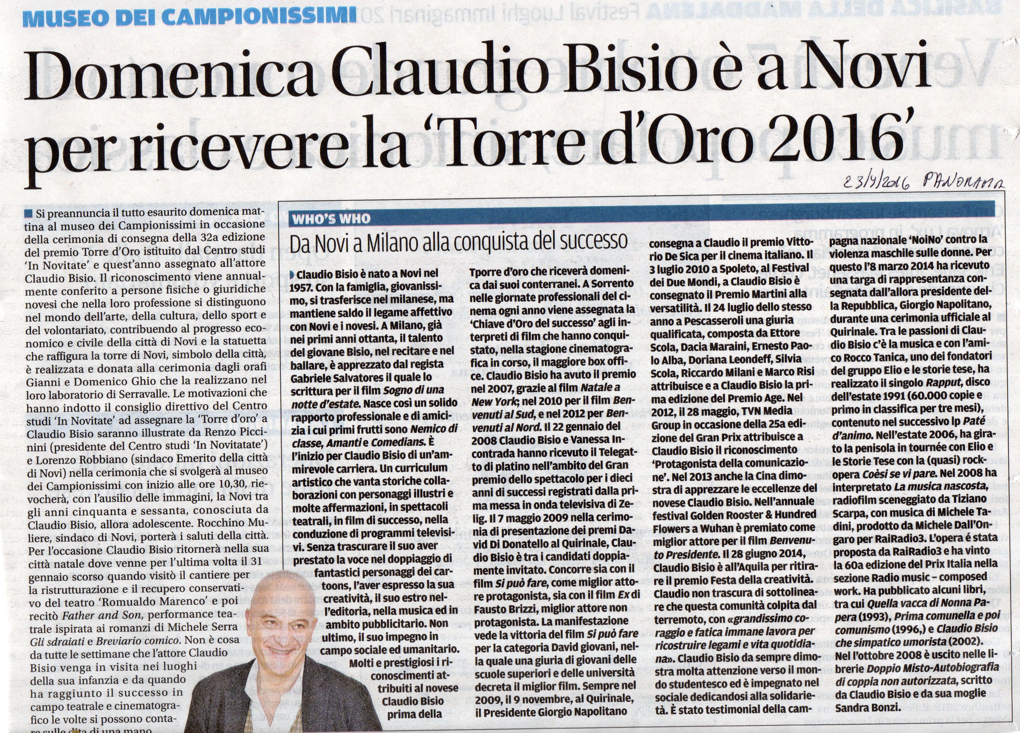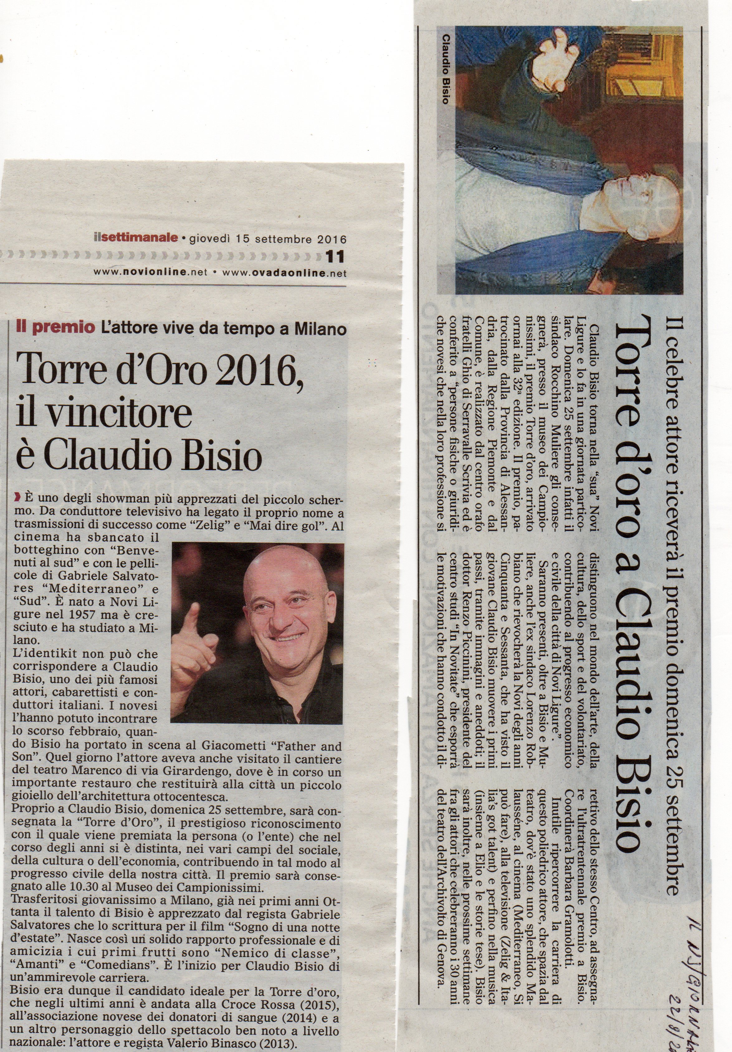 Claudio è nato a Novi Ligure 59 anni fa ma, sebbene vi abbia vissuto per breve tempo prima del trasferimento a Milano, non si è mai realmente separato dalla sua città natale. Conosce a memoria le canzoni dialettali e i detti che gli ha insegnato la nonna, e ama tornarci in sella alla bici per riscoprire i paesaggi dell’infanzia. Dopo essere stato al Teatro Giacometti nel febbraio 2015 con lo spettacolo “Father and Son”, il 25 settembre 2016 è ritornato in città presso il Museo dei Campionissimi per ritirare il prestigioso riconoscimento “Torre d’Oro”.