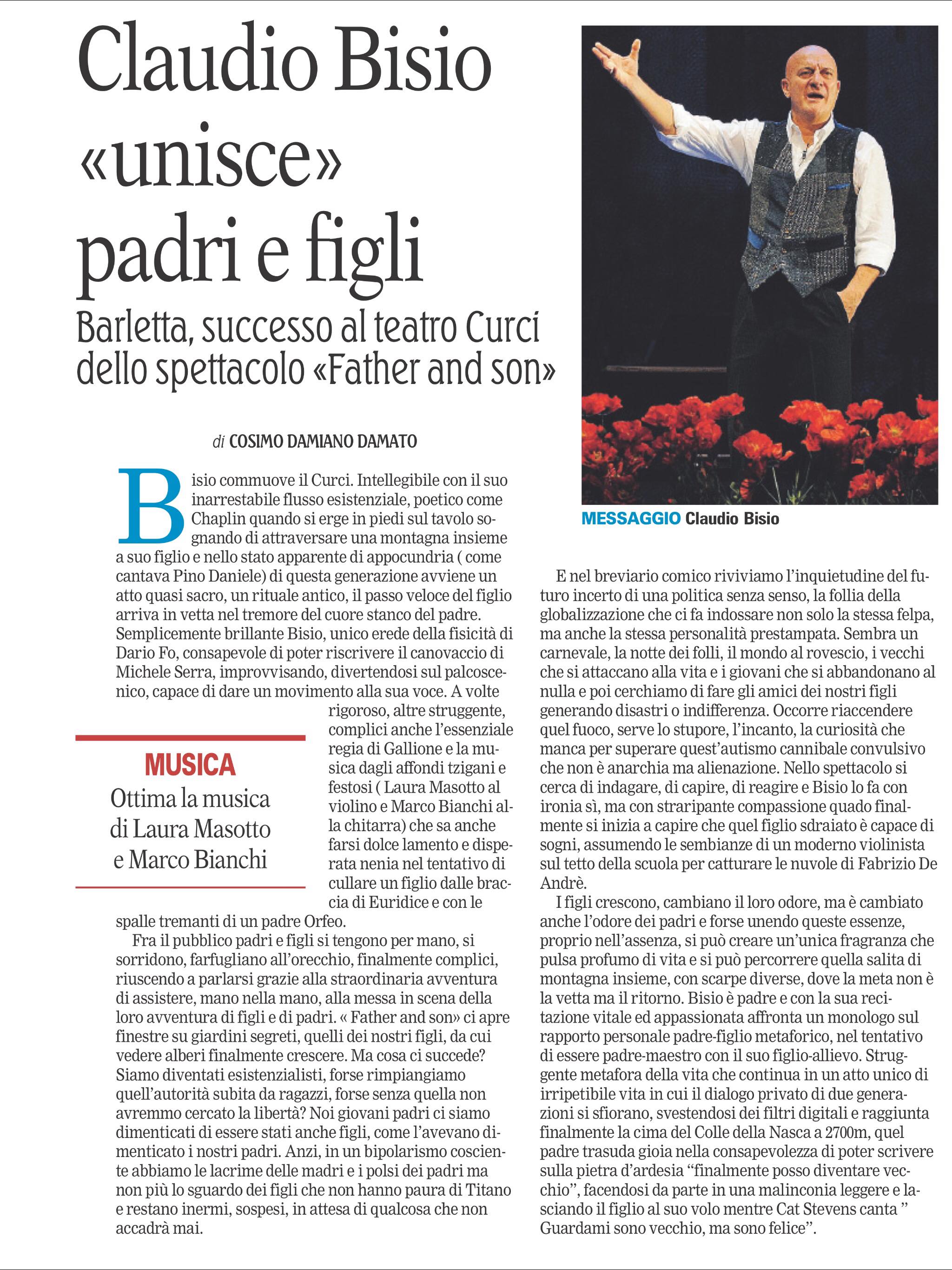 Anna Bandettini, recensendo lo spettacolo per “Repubblica”, ha scritto: «Il regista ha fatto un ottimo lavoro, lasciando anche spazio alla bella partitura musicale di Paolo Silvestri. Claudio Bisio trova equilibrio e misura nel cogliere in questo papà il lato ironico e eroico, senza farne una maschera, impotente di fronte a quei silenzi, buffamente servile verso il figlio sdegnoso. In chiara complicità col personaggio, come buona parte della platea che alla fine canta con Cat Stevens Father and Son».