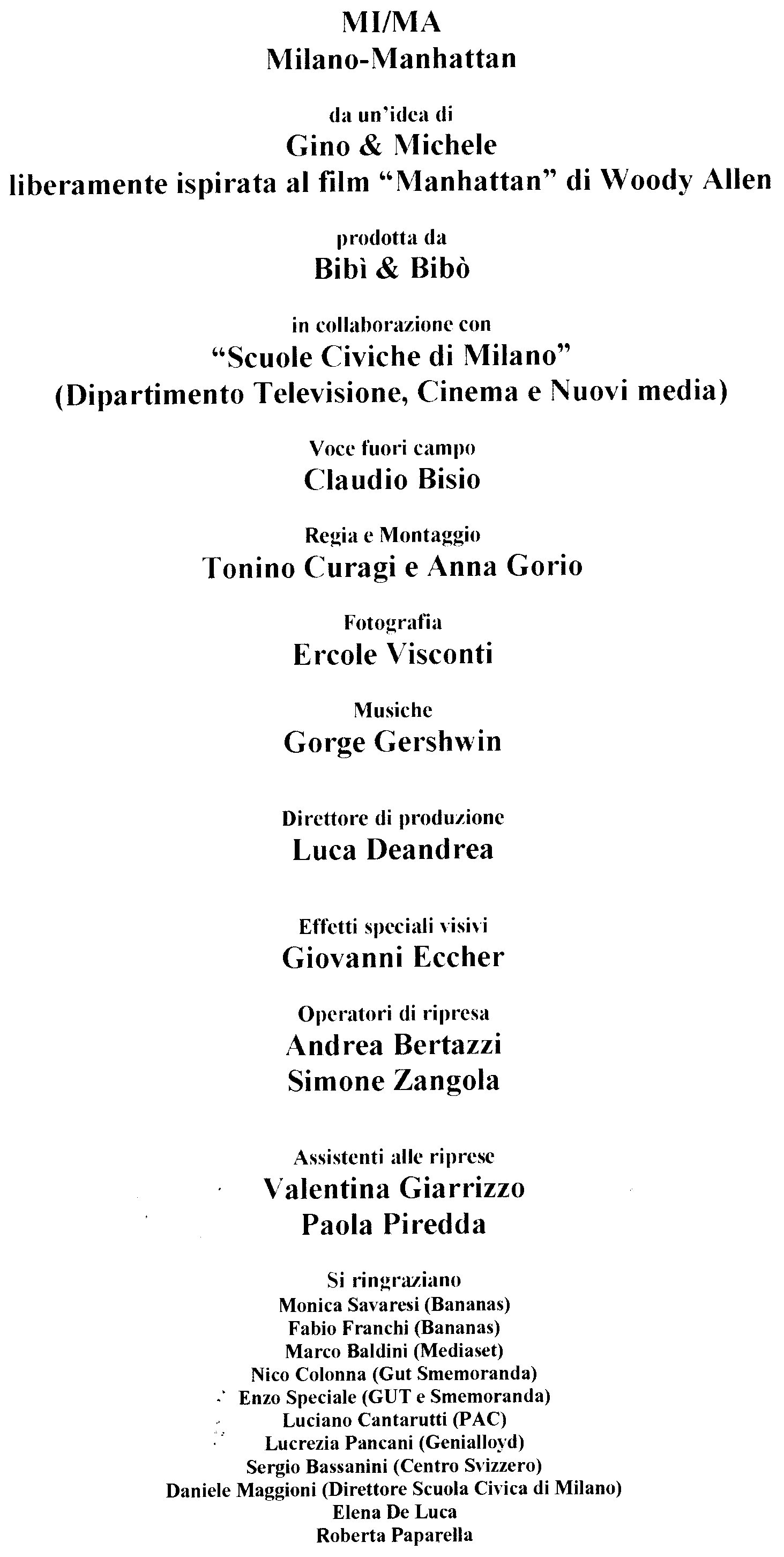 “Si dice che il gusto più profondo di ogni viaggio sia il ritorno. Proprio in quel sottile piacere che pervade ogni viaggiatore quando riprende possesso delle sue radici, sta il segreto di questo paragone tra Milano e New York. Così è nato Mi/Ma, Milano/ Manhattan, tributo all'incipit del capolavoro di Woody Allen, rigorosamente in bianco e nero, come nell'originale. (…) Contravvenendo ad ogni regola logica abbiamo cercato di cogliere nei primi 4 minuti del film Manhattan il senso, oltre che della megalopoli americana, anche della nostra città e forse per certi aspetti, della vita di noi che la abitiamo.” (Michele Mozzati)